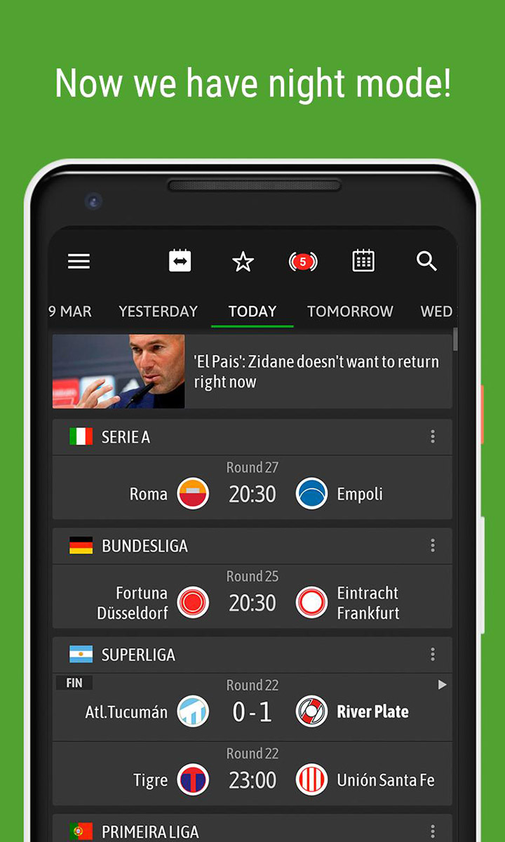 To start with, Android users in BeSoccer can quickly engage themselves in the simple and accessible mobile app, thanks to its elegant interface and intuitive features. Feel free to navigate in the app to explore the accessible menus and work with certain in-app features. You can also make uses of the energy-saving mode with the night theme to reduce the intense lights and protect your eyes,